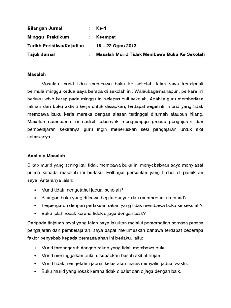 2.0 jurnal refleksi 2.1 masalah pertama (masalah disiplin pelajar)perkararefleksi kenal pasti masalahsaya mengajar di kelas tingkatan 4e2 sekolah menengah kebangsaan long ghaffar 2. Aminuddin hehsan & siti noor muhamad. Masalah disiplin pelajar berdasarkan jantina di kolej komuniti hulu langat hanin falina mohd hashim1 siti nor lailiyah ibrahim2 kolej komuniti hulu langat kementerian pendidikan malaysia. Please fill this form, we will try to respond as soon as possible. Download disiplin pelajar pdf books.